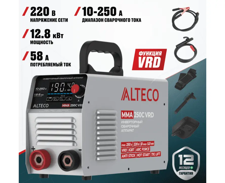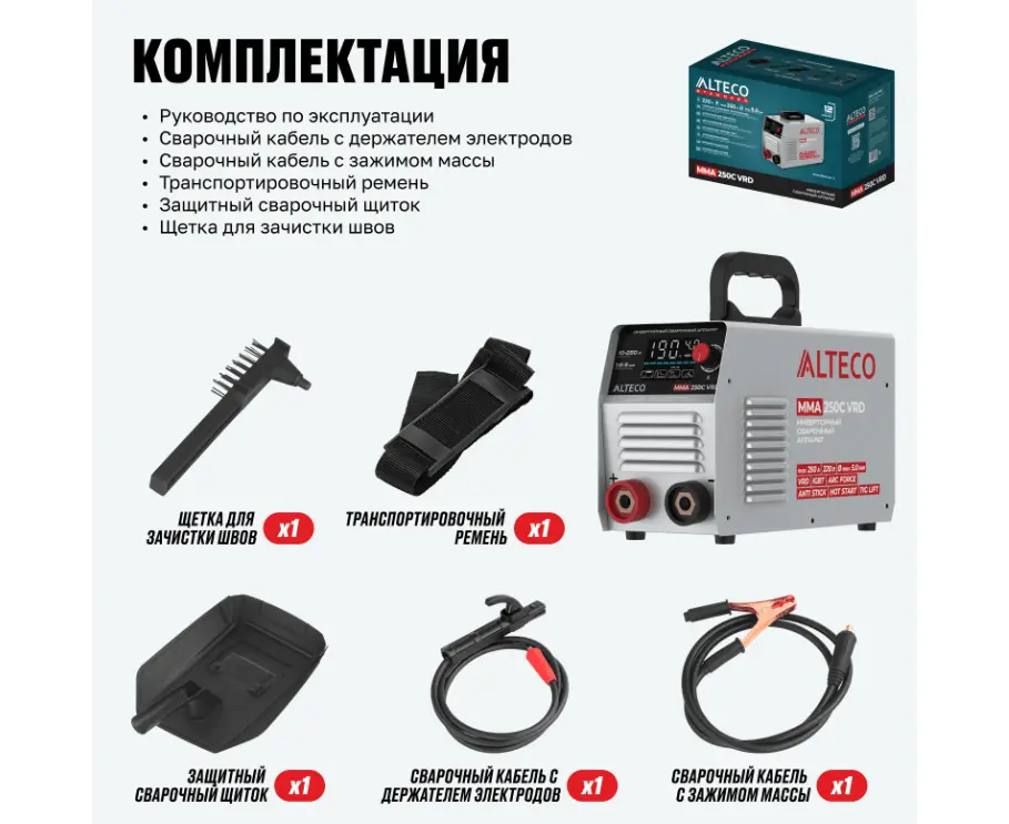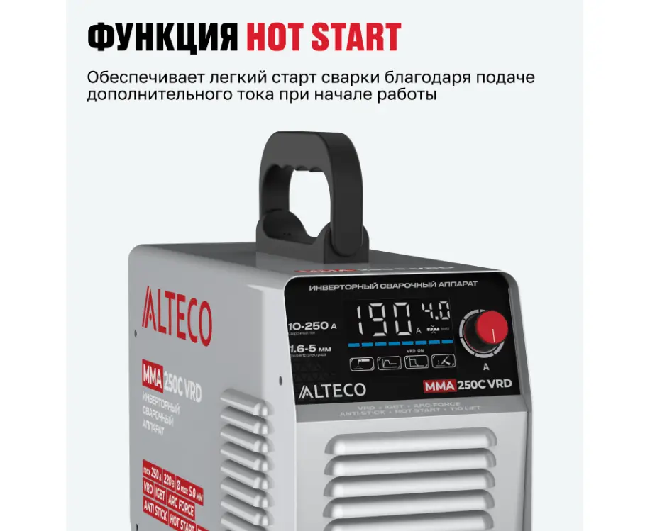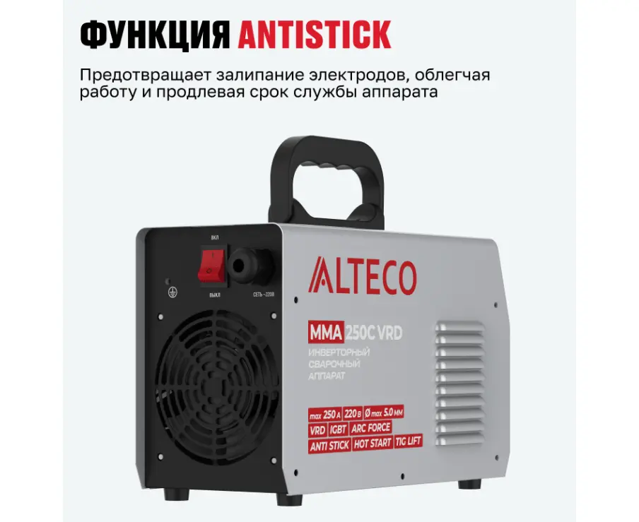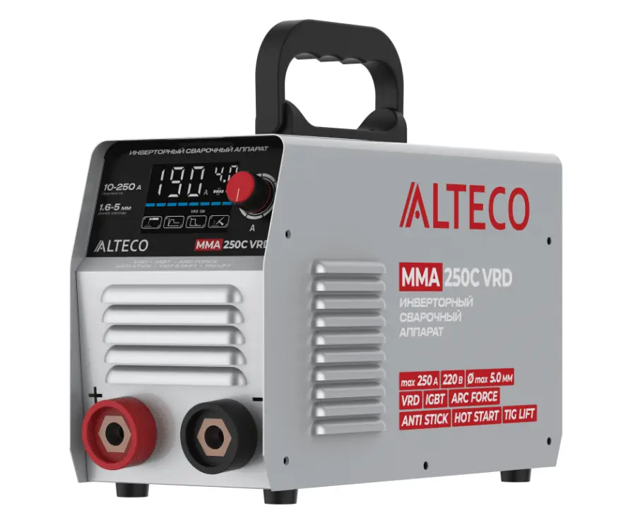 Сварочный аппарат Alteco (Алтеко) MMA 250C VRD - компактное и надёжное решение для бытовой сварки. Идеален для начинающих и домашних мастеров: лёгкий, портативный и простой в освоении. Удобен как для использования в домашних условиях, так и для выездных работ. Оснащён современными технологиями, обеспечивающими стабильную дугу и безопасную работу. Отличный выбор для мелких сварочных задач в гараже, на даче или при ремонте.