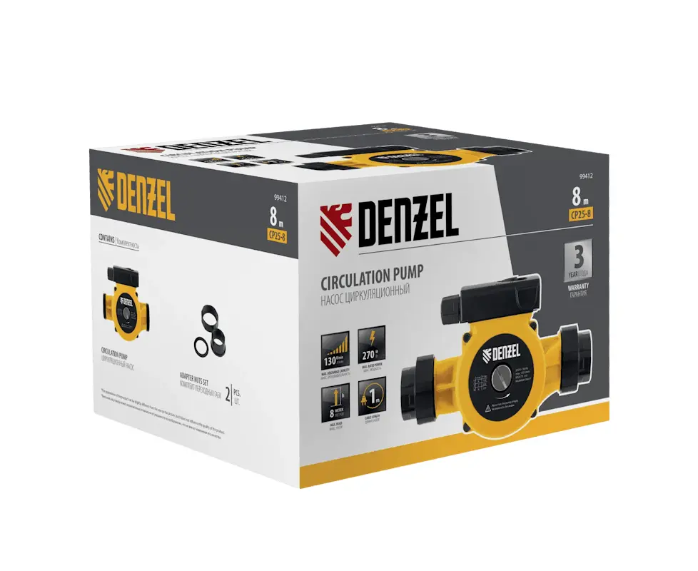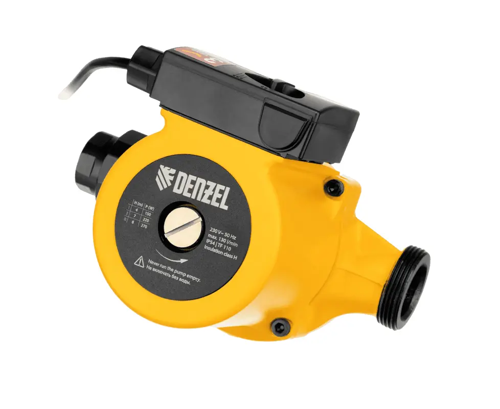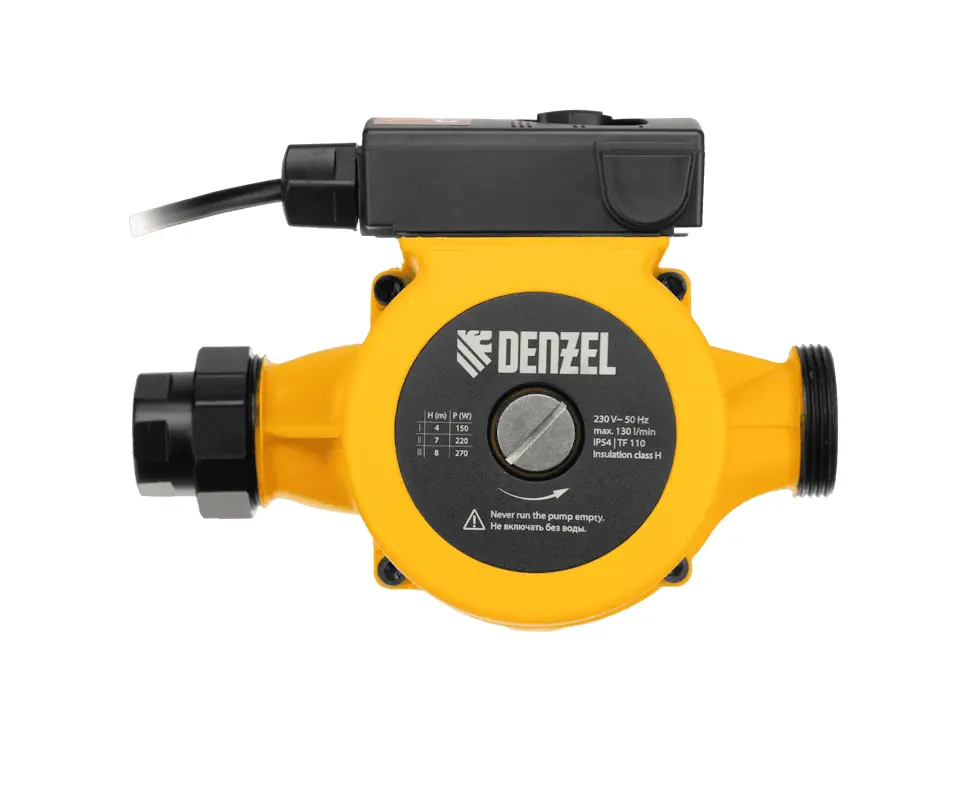 Циркуляционный насос Denzel (Дензел) CP25-8 - с кабелем длиной 1 м имеет монтажную длину 180 мм и обеспечивает напор до 8 м, максимальный объем перекачиваемой жидкости составляет 130 л/мин. Устройство обеспечивает непрерывное движение горячей воды температурой до 110 °C по трубопроводу. Насос позволит организовать эффективную систему теплоснабжения загородного дома.