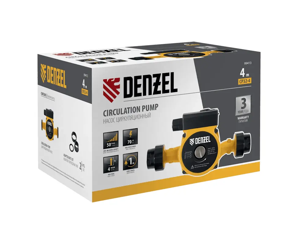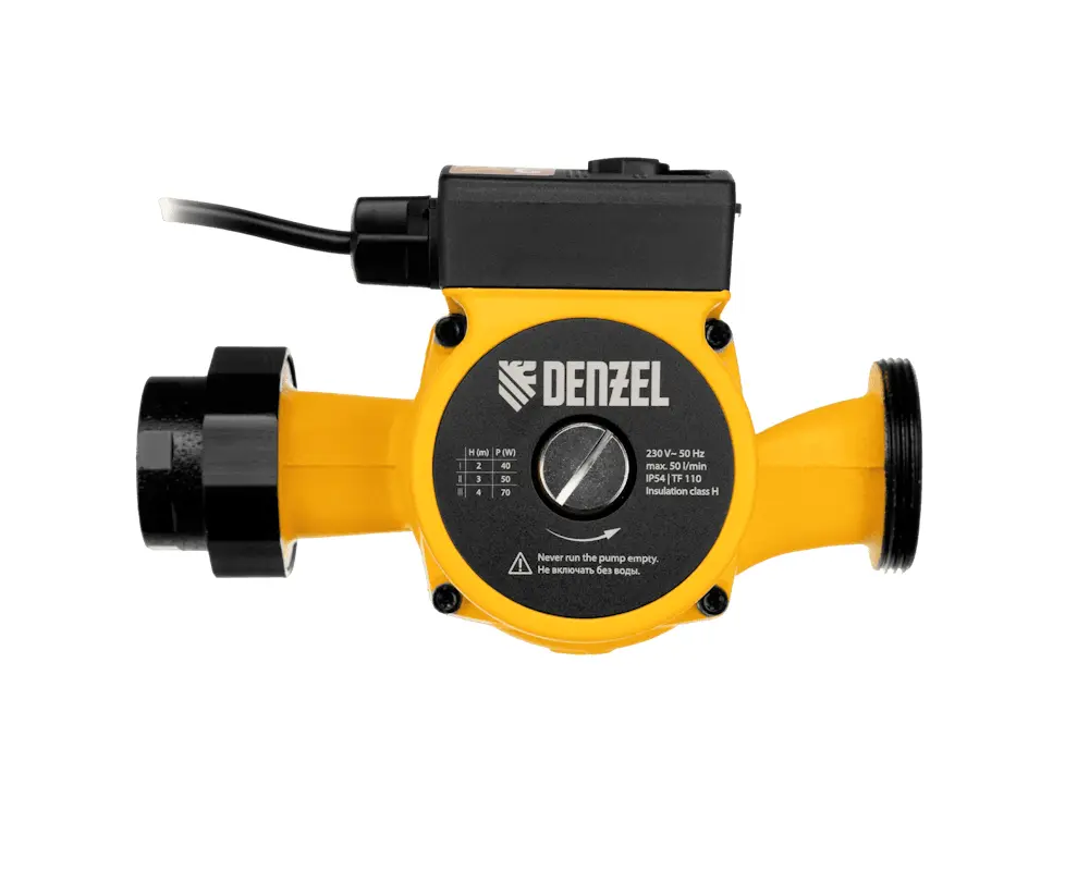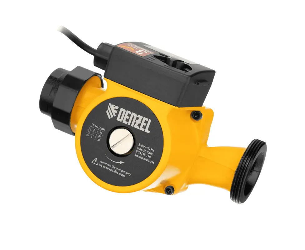 Циркуляционный насос Denzel (Дензел) CP32-4 - с кабелем длиной 1 м имеет монтажную длину 180 мм и обеспечивает напор до 4 м, максимальный объем перекачиваемой жидкости составляет 50 л/мин. Устройство обеспечивает непрерывное движение горячей воды температурой до 110 °C по трубопроводу. Насос позволит организовать эффективную систему теплоснабжения загородного дома.