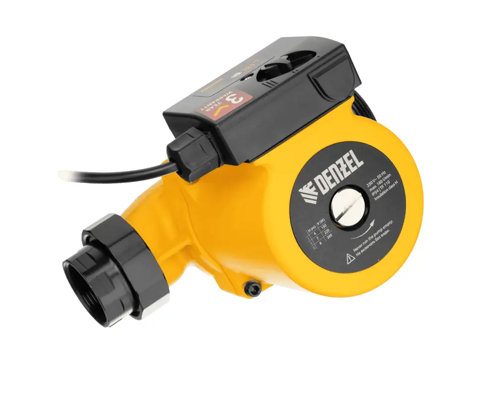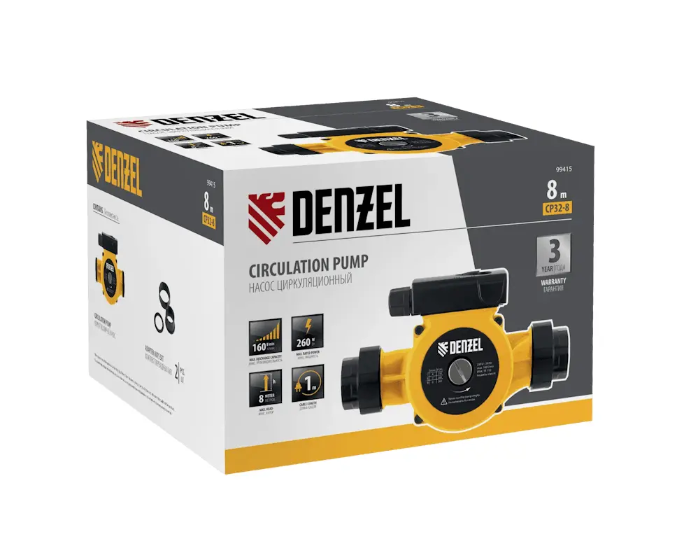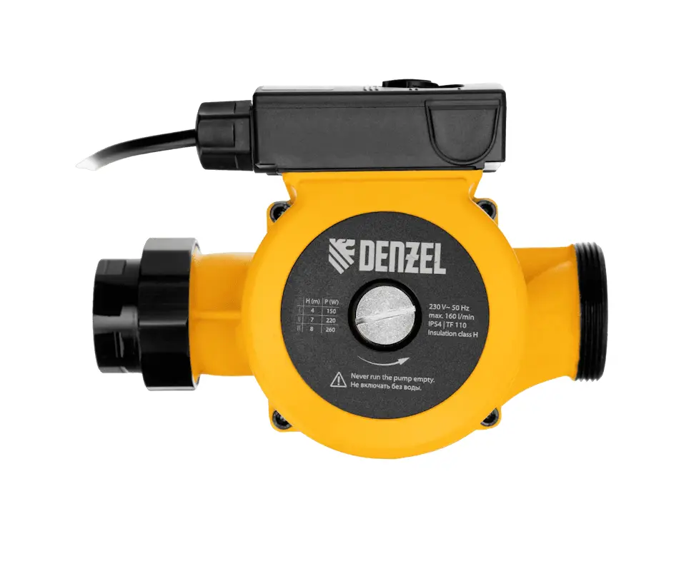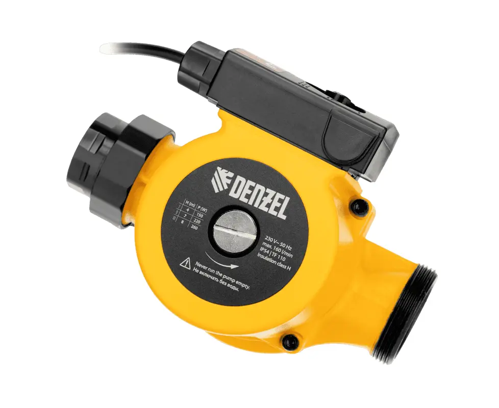 Циркуляционный насос Denzel (Дензел) CP32-8 - с кабелем длиной 1 м имеет монтажную длину 180 мм и обеспечивает напор до 8 м, максимальный объем перекачиваемой жидкости составляет 160 л/мин. Устройство обеспечивает непрерывное движение горячей воды температурой до 110 °C по трубопроводу. Насос позволит организовать эффективную систему теплоснабжения загородного дома.
