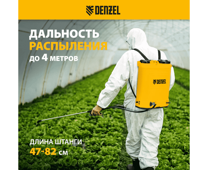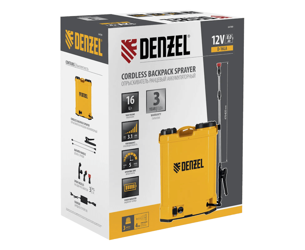 Опрыскиватель Denzel (Дензел) D-16LA - с баком объемом 16 л и батареей на 12 В, емкостью 8 Ач, предназначен для распыления воды или инсектицидов. Используется для ухода за растениями, дезинфекции помещения, мытья окон и фасадов. Длина штанги регулируется в диапазоне 470-820 мм, а максимальная дальность распыления составляет 4 м, что облегчает обработку труднодоступных мест.