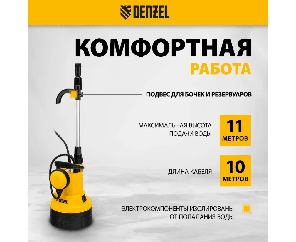 Насос Denzel (Дензел) DPB400 - мощностью 400 Вт работает со скоростью 5500 л/ч и обеспечивает подъем перекачиваемой жидкости на высоту до 11 м. Погружается на глубину до 7 м, применяется для организации систем полива и водоснабжения на приусадебном участке, подходит также для выполнения осушительных работ. Забор воды происходит из колодцев, водоемов, бассейнов, различных резервуаров, бочек и других накопителей. Максимальный диаметр перекачиваемых частиц составляет 5 мм.