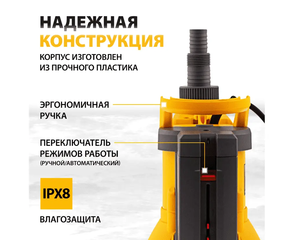 - Эргономичность — благодаря рукоятке на корпусе насос удобно перемещать и погружать.