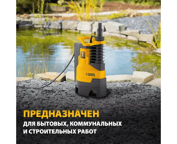 Насос Denzel (Дензел) DPХ450 - мощностью 450 Вт способен перекачивать до 9000 л воды в час и поднимать ее на высоту до 5 м. Используется для подачи чистой воды из резервуаров и организации систем орошения. Также подходит для откачивания грязной воды с частицами диаметром до 35 мм из канав и подвалов. Для предотвращения работы на сухом ходу предусмотрен поплавковый механизм.