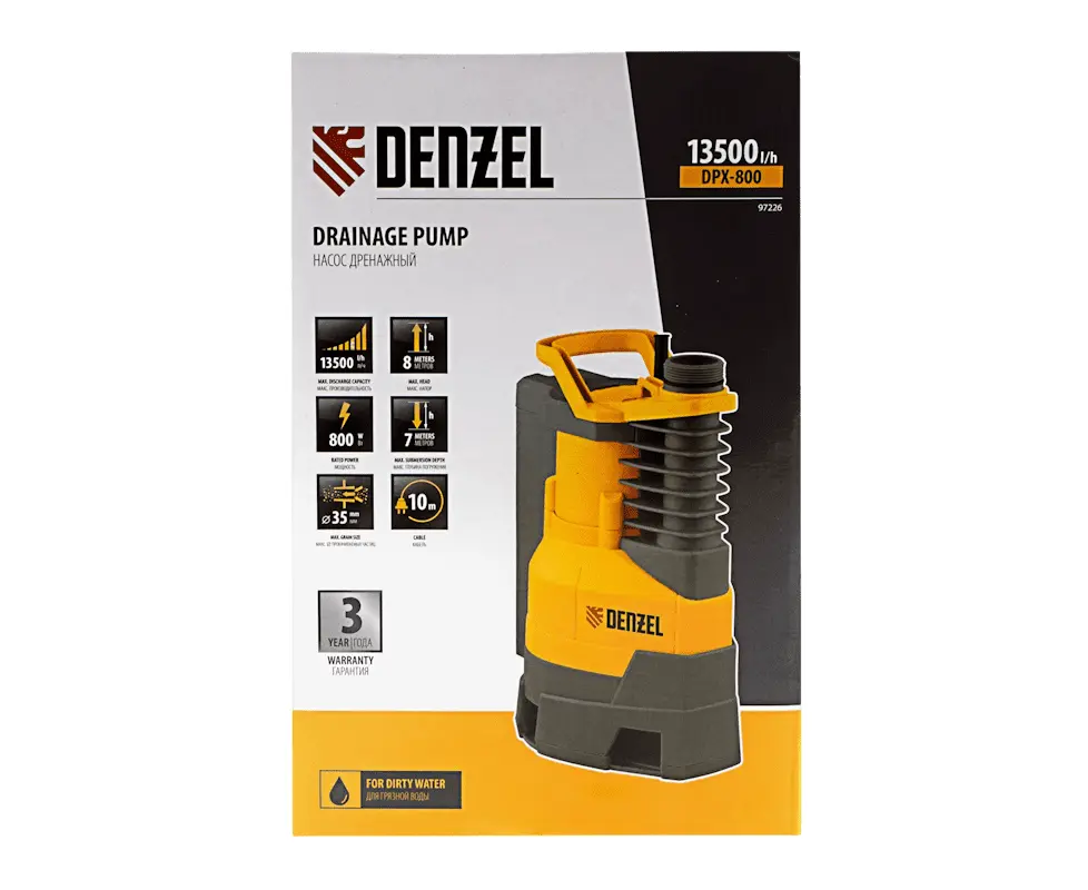 Насос Denzel (Дензел) DPХ800 - мощностью 800 Вт и производительностью 13500 л/ч обеспечивает высоту подъема 8 м и используется для подачи чистой воды из резервуаров и организации систем орошения. Также подходит для быстрого откачивания грязной воды с частицами до 35 мм из канав и подвалов. Насос оснащен поплавковым механизмом для предотвращения работы на сухом ходу.