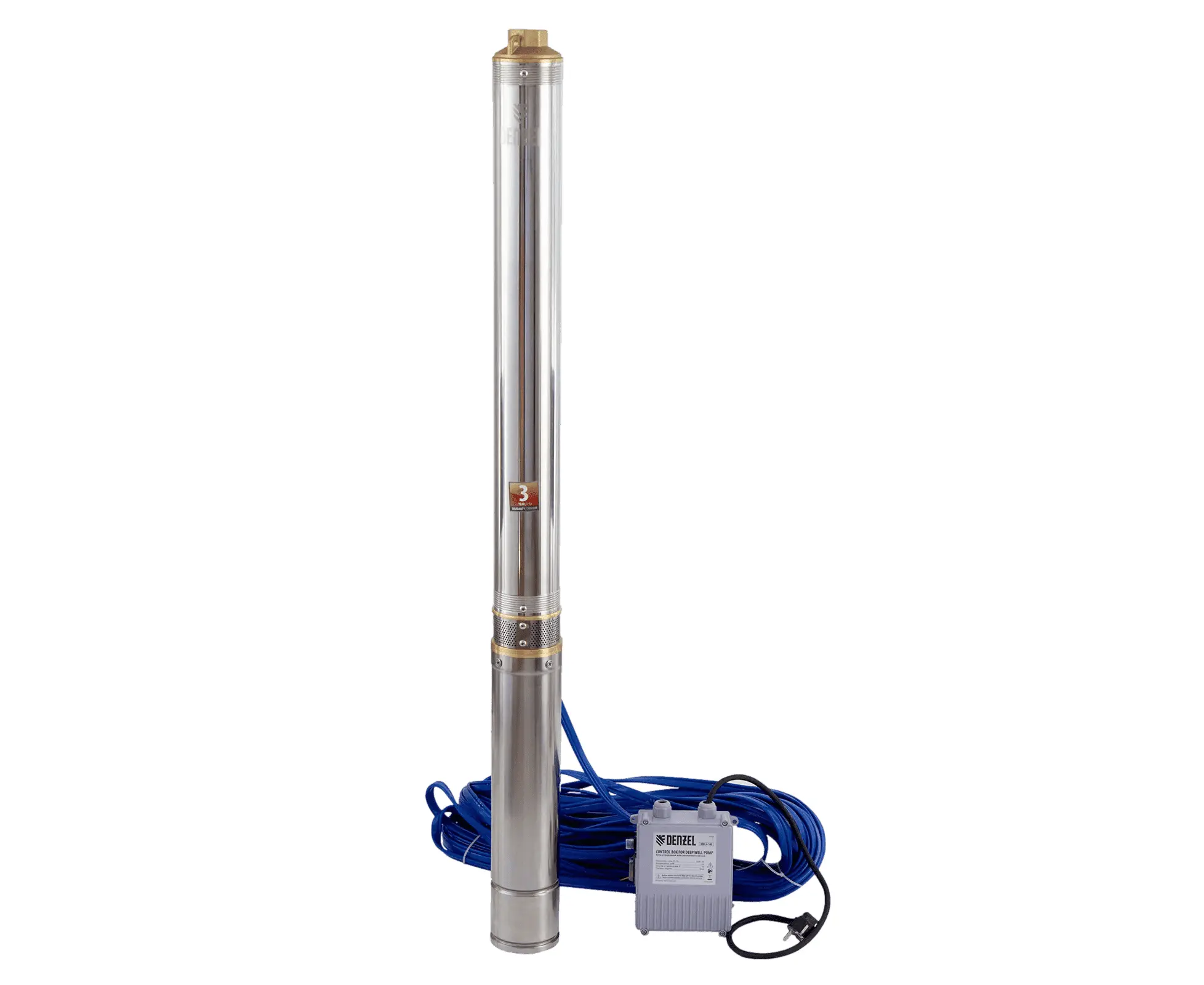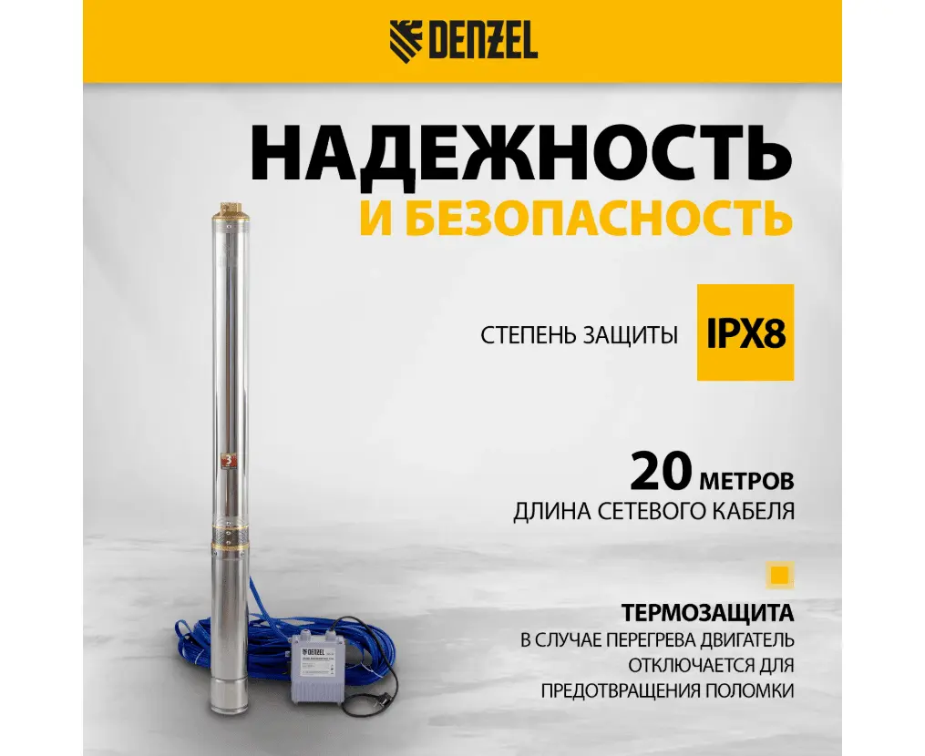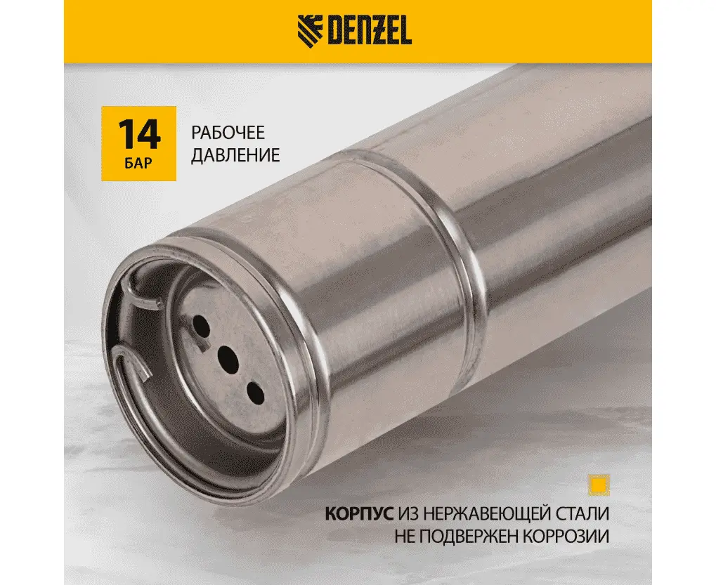 Скважинный насос Denzel (Дензел) DWC-4-140 - производительностью 6000 л/ч, диаметром 4″ и мощностью 2200 Вт обеспечивает напор до 140 м. Предназначен для подачи чистой воды из скважин, колодцев, систем водоснабжения, различных накопителей и пресных водоемов с глубины до 27 м (с наращиванием кабеля — до 80 м). Насосная часть из 19 центробежных импеллеров обеспечивает повышенную производительность, что позволяет организовать не только полив приусадебных участков, но и бытовое водоснабжение.