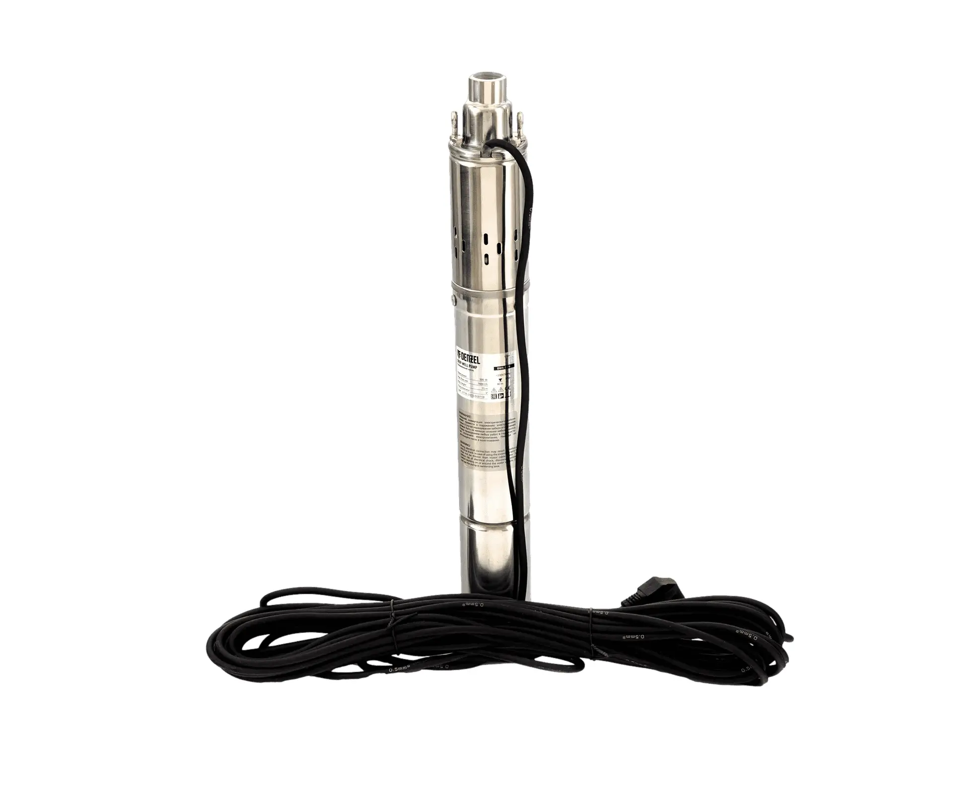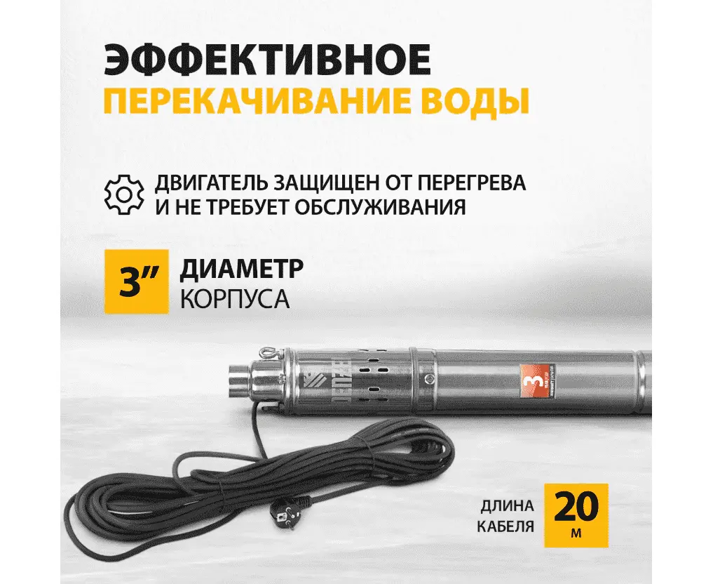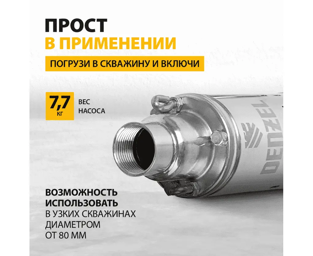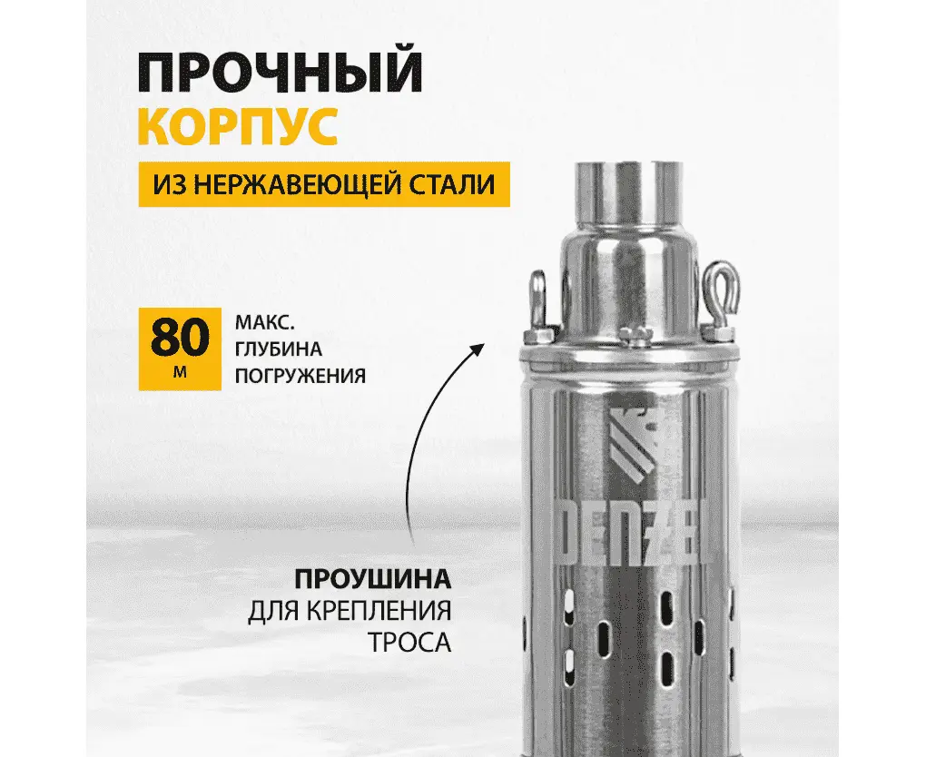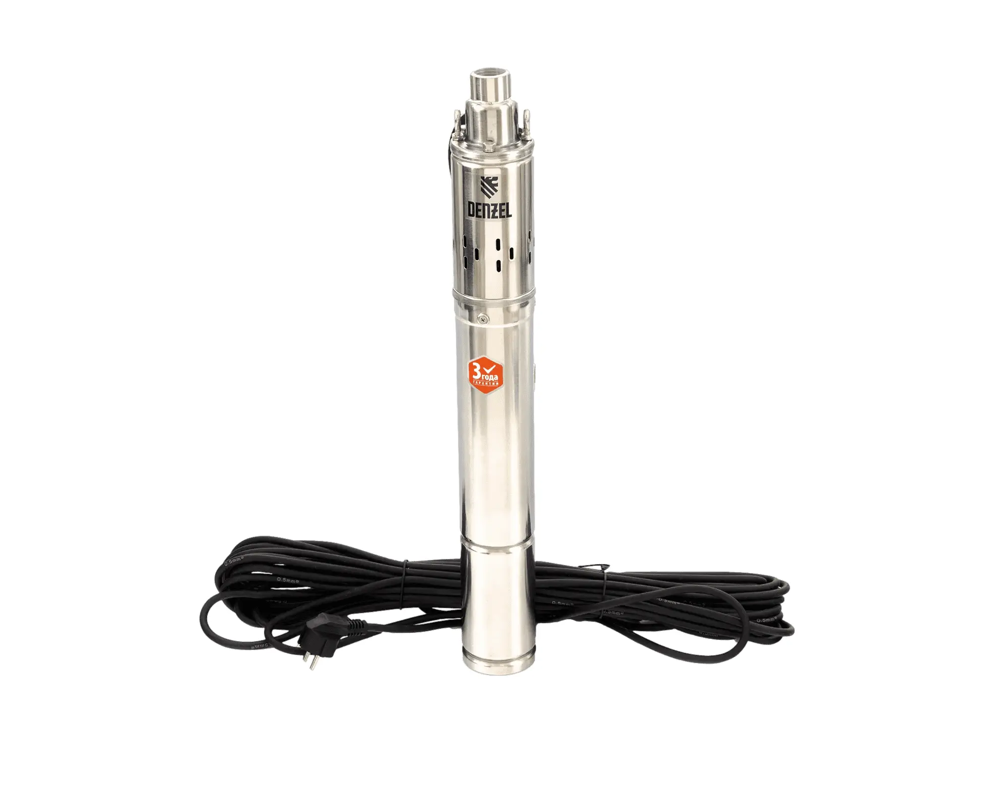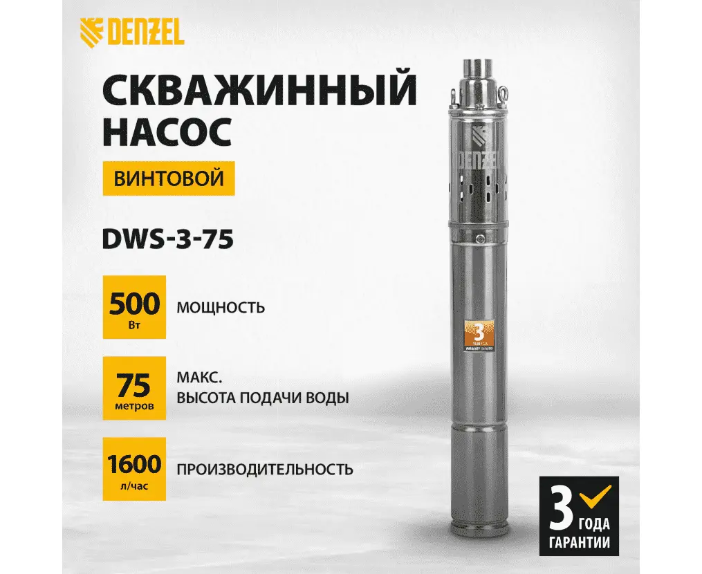 Скважинный насос Denzel (Дензел) DWS-3-75 - диаметром 3 дюйма потребляет мощность 500 Вт, перекачивает воду со скоростью 1600 л/ч и обеспечивает напор до 75 м. Предназначен для подъема чистой воды с глубины до 80 м из скважин и колодцев. Используется для организации систем водоснабжения и полива на даче, садовом участке или в загородном доме.