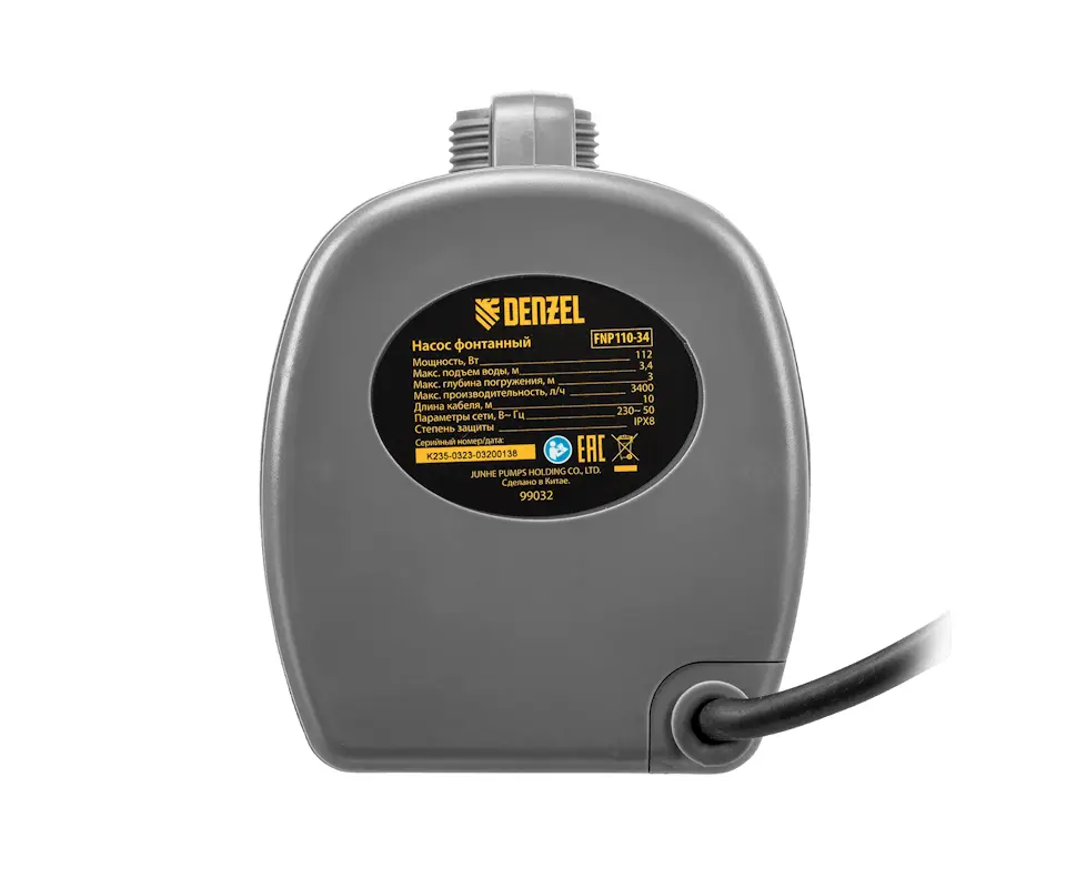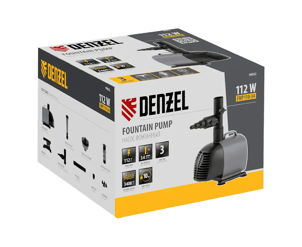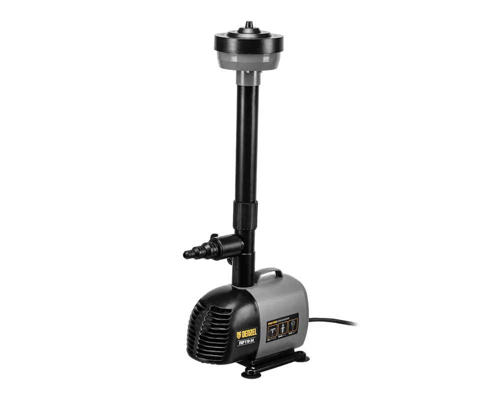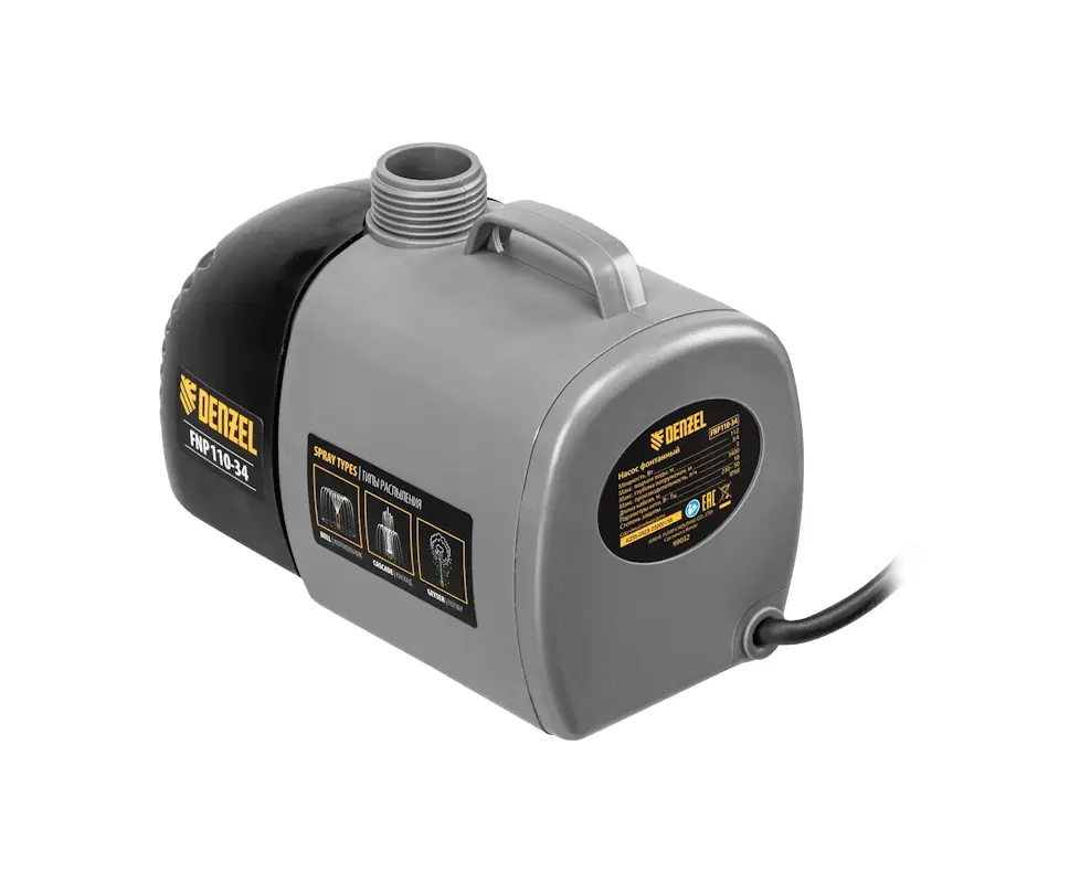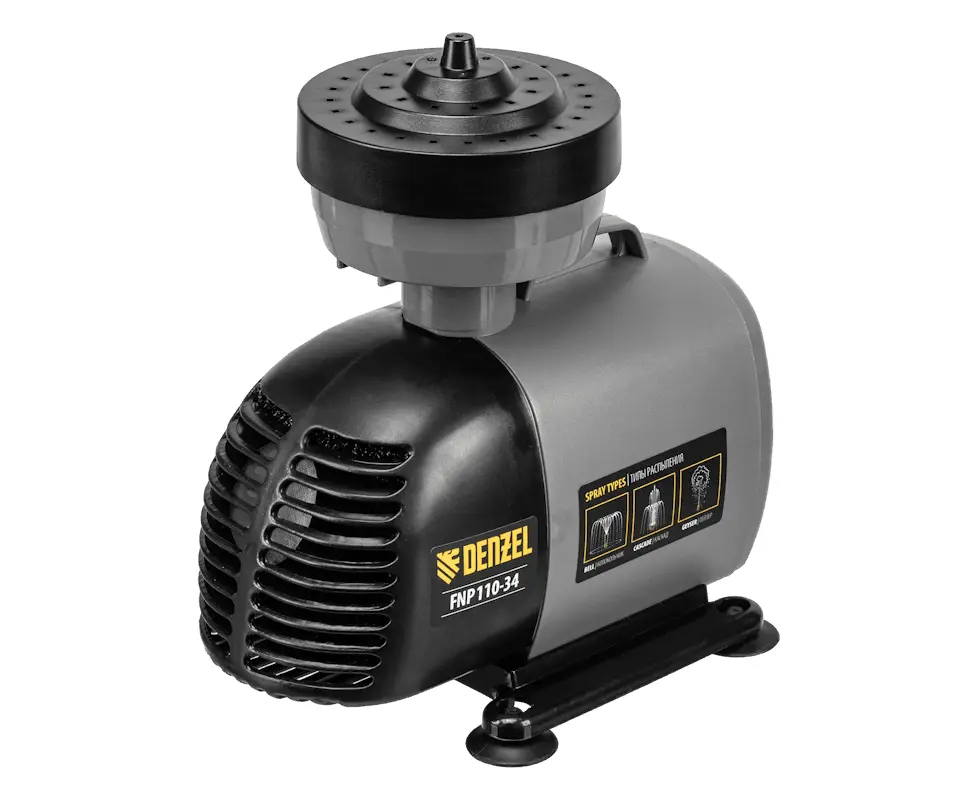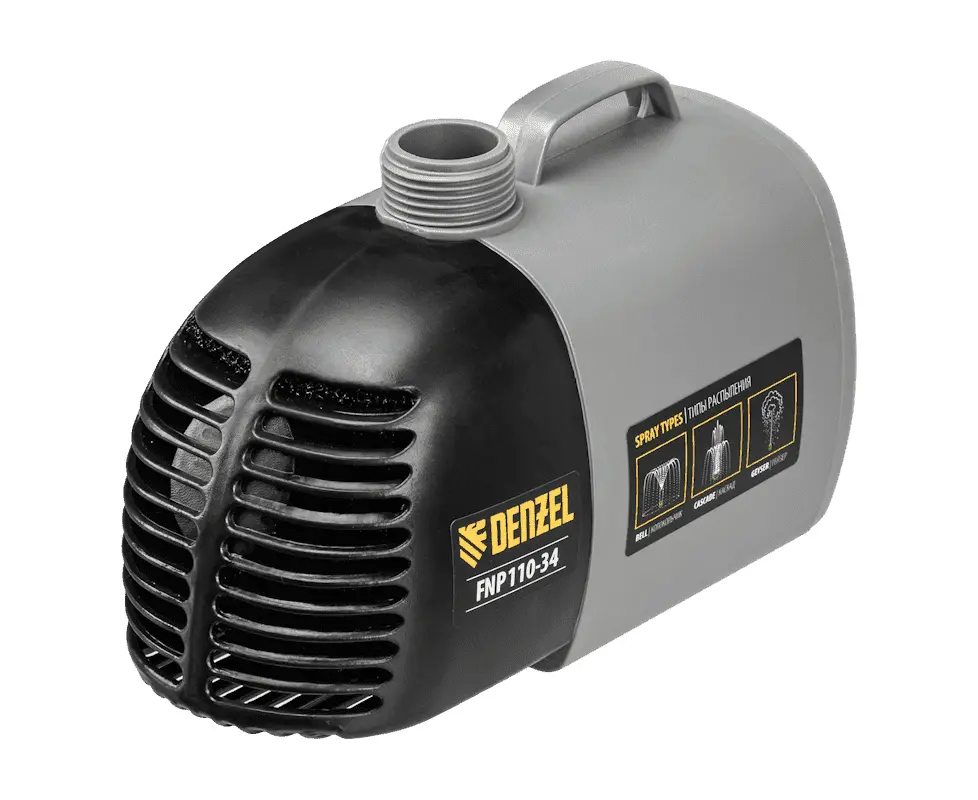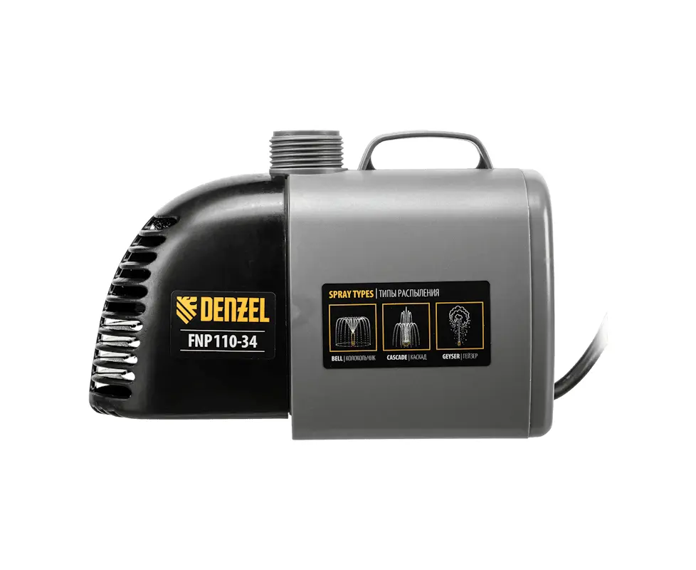 Насос Denzel (Дензел) FNP110-34 - мощностью 112 Вт, с насадками колокольчик/каскад/гейзер, перекачивает 3400 л воды в час и обеспечивает максимальную высоту подъема 3,4 м. Позволяет создать декоративный фонтан, украсив водоем и оживив ландшафт дачного участка. Установив одну из входящих в комплект насадок, можно получить наиболее подходящий тип струи: в виде колокольчика, каскада или гейзера. Также в конструкции насоса предусмотрен специальный патрубок для создания водопада.