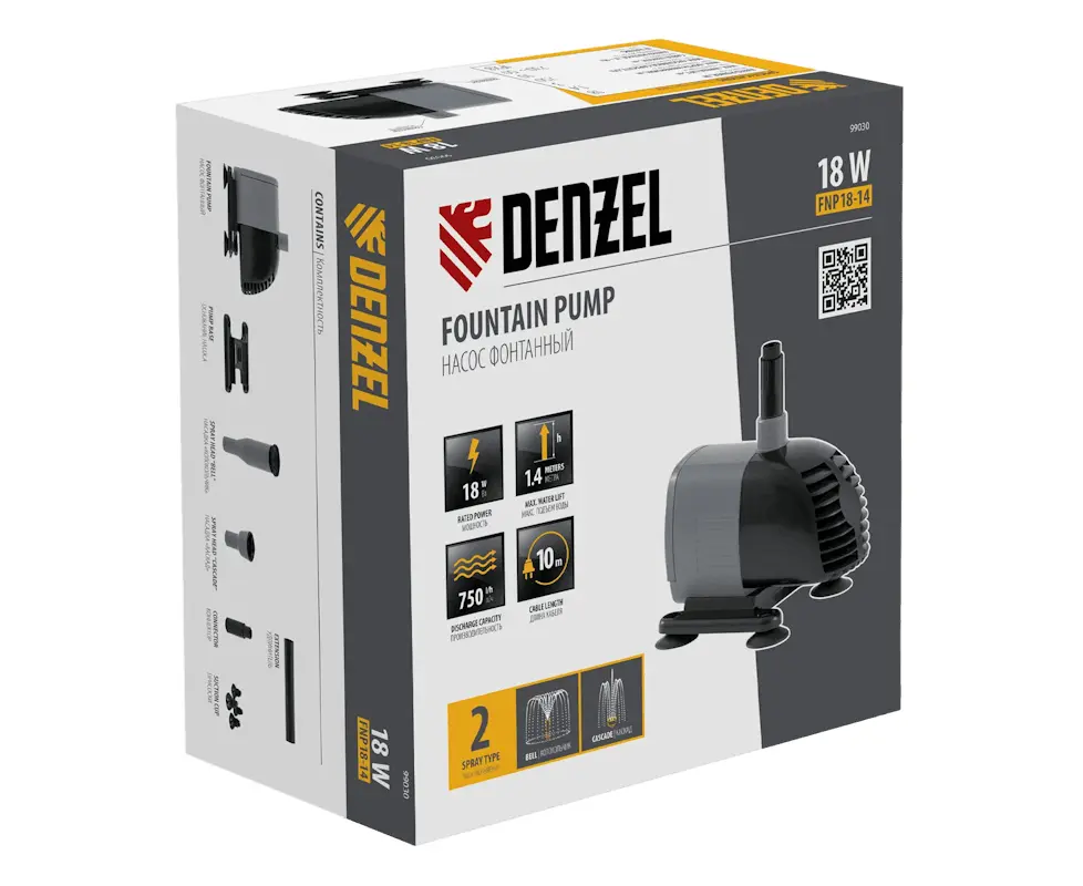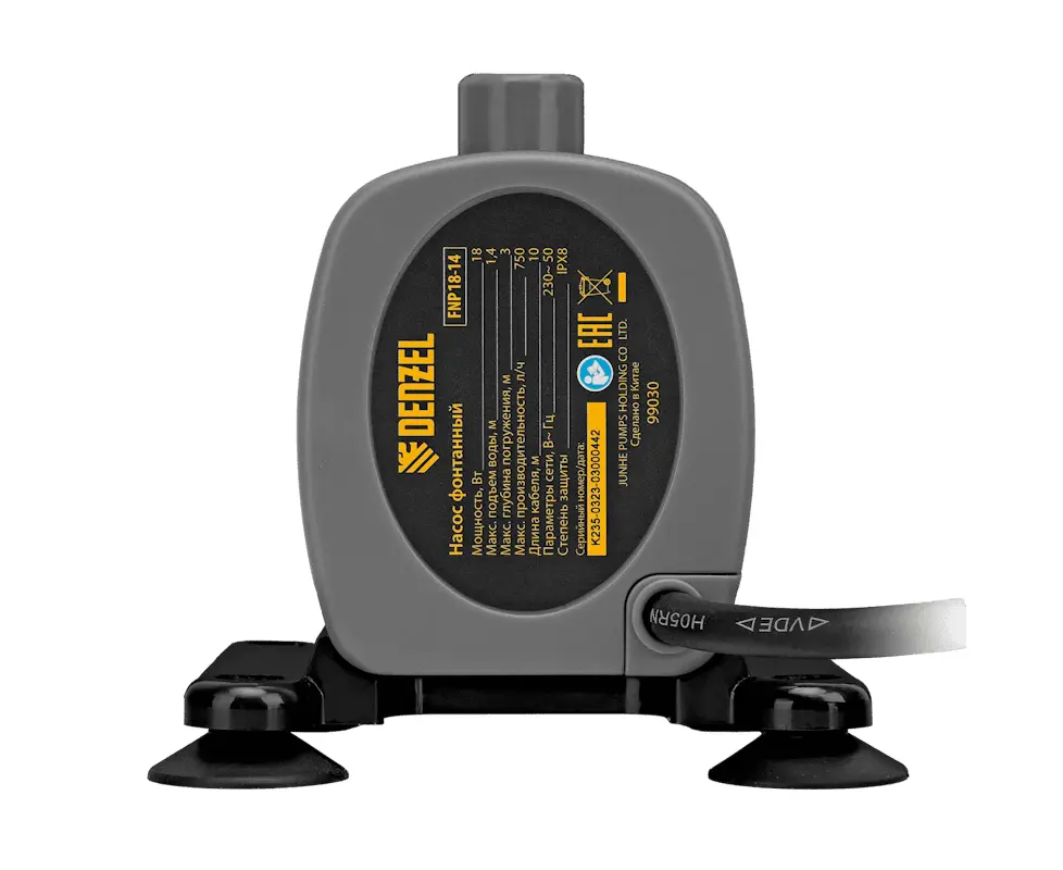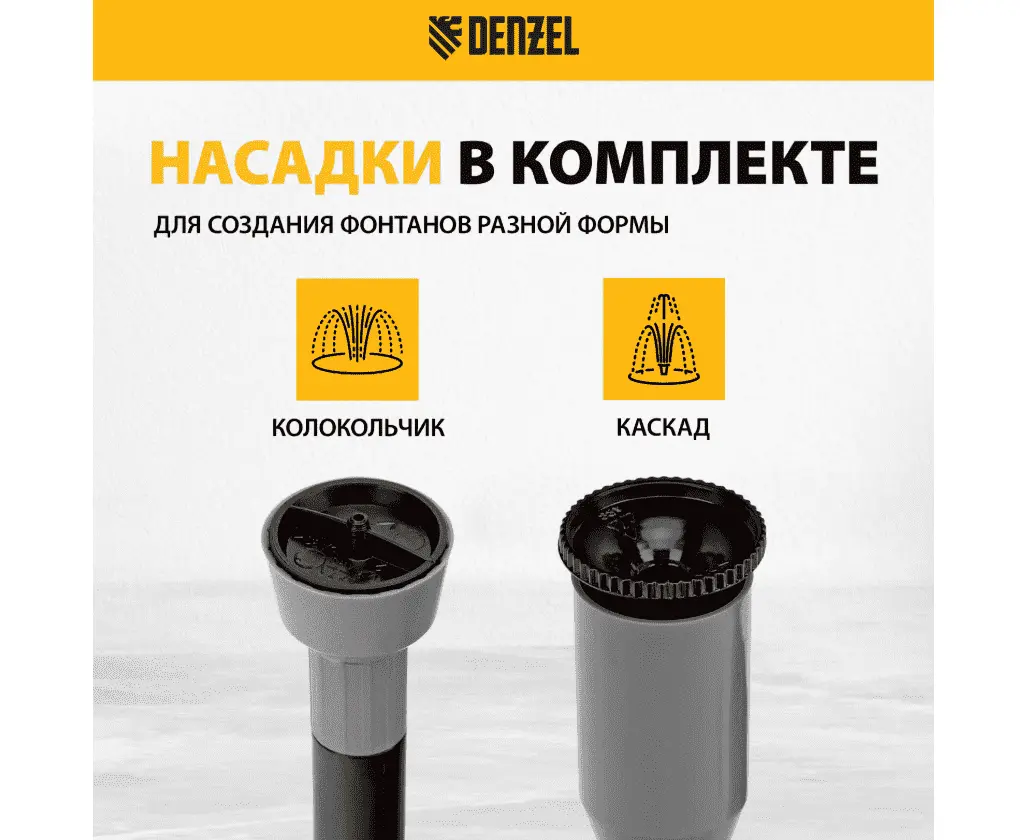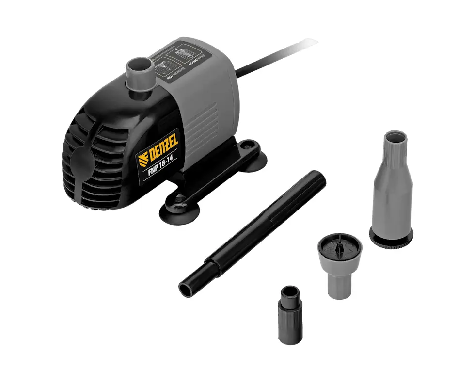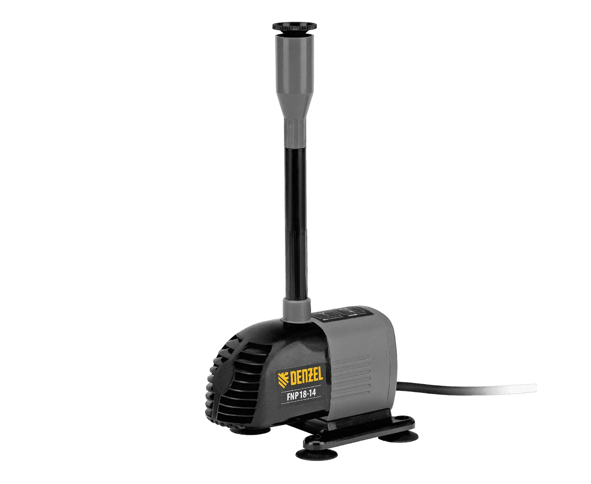 Насос Denzel (Дензел) FNP18-14 - мощностью 18 Вт, с насадками колокольчик/каскад, перекачивает 750 л воды в час и обеспечивает максимальную высоту подъема 1,4 м. Позволяет создать декоративный фонтан, украсив водоем и оживив ландшафт дачного участка. Установив одну из двух входящих в комплект насадок, можно получить наиболее подходящий тип струи: в виде колокольчика или каскада.