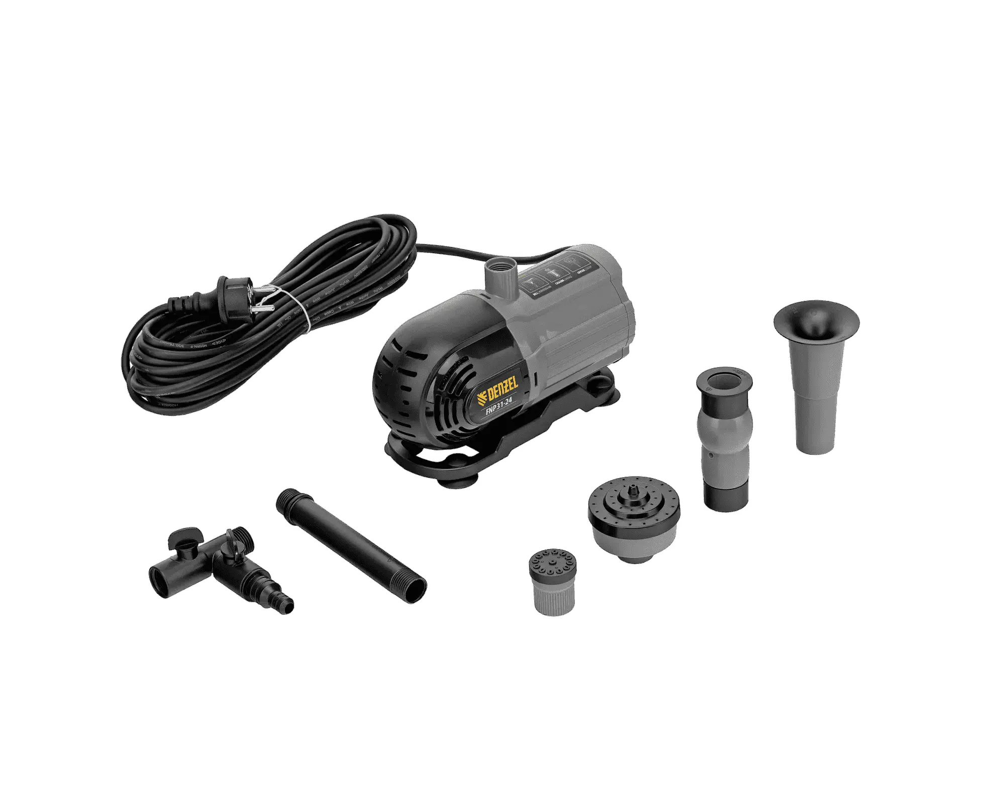 Насос Denzel (Дензел) FNP31-24 - мощностью 31 Вт, с насадками колокольчик/гейзер/каскад, перекачивает 1500 л воды в час и обеспечивает максимальную высоту подъема 2,4 м. Позволяет создать декоративный фонтан, украсив водоем и оживив ландшафт дачного участка. Установив одну из входящих в комплект насадок, можно получить наиболее подходящий тип струи: в виде колокольчика, гейзера, большого или малого каскада. Также в конструкции насоса предусмотрен специальный патрубок для создания водопада.
