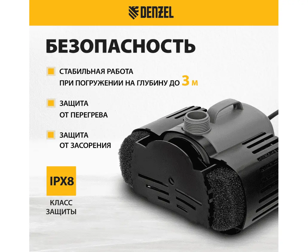 - Водонепроницаемость — насос имеет степень защиты IPX8 и стабильно работает при погружении в воду на глубину до 3 м.