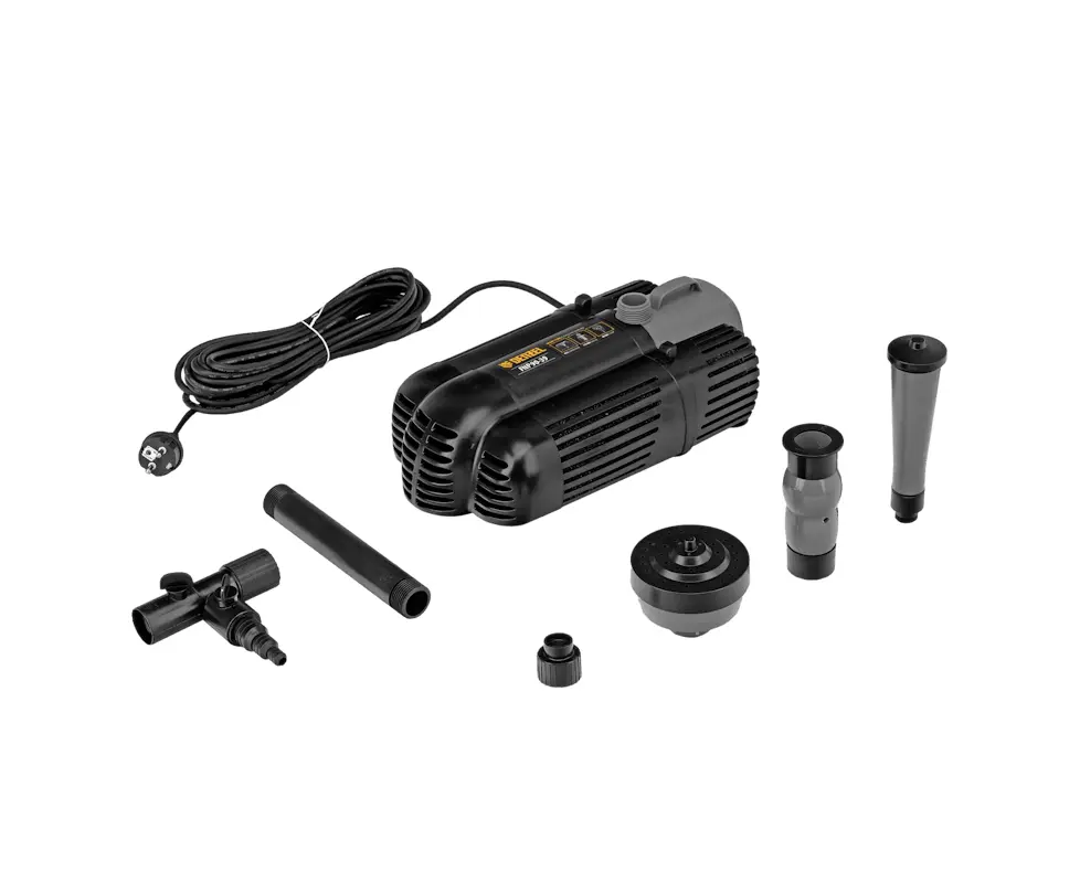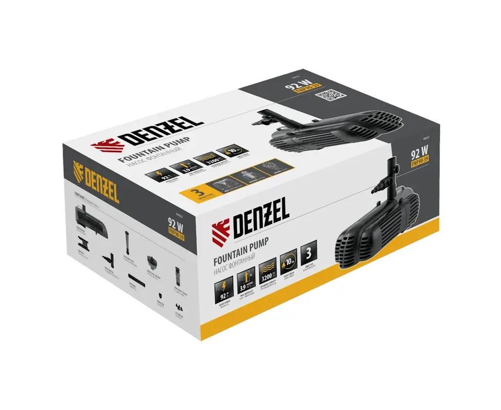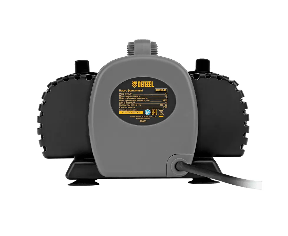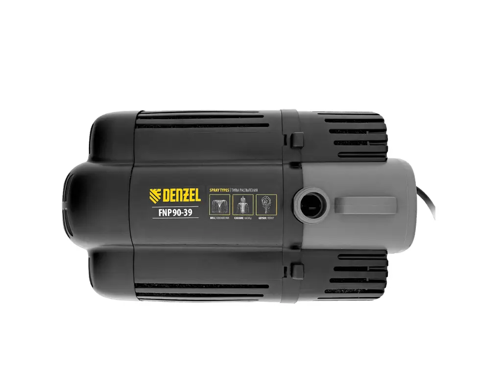 Насос Denzel (Дензел) FNP90-39 - мощностью 92 Вт, с насадками колокольчик/каскад/гейзер, перекачивает 3200 л воды в час и обеспечивает максимальную высоту подъема 3,9 м. Позволяет создать декоративный фонтан, украсив водоем и оживив ландшафт дачного участка. Установив одну из входящих в комплект насадок, можно получить наиболее подходящий тип струи: в виде колокольчика, каскада или гейзера. Также в конструкции насоса предусмотрен специальный патрубок для создания водопада.