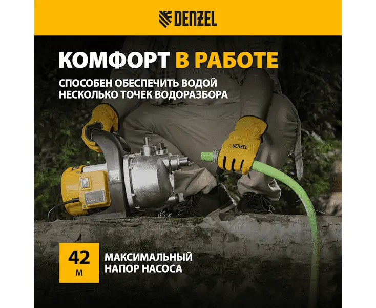 Насос Denzel (Дензел) GPL800Х - мощностью 800 Вт и производительностью 3200 л/ч, с корпусом из «нержавейки», предназначен для забора чистой воды из колодцев, водоемов, различных резервуаров, и подъема ее на высоту до 42 м. Используется для проведения поливочных работ или организации системы водоснабжения в загородном доме. Способен обеспечить водой несколько точек водоразбора.