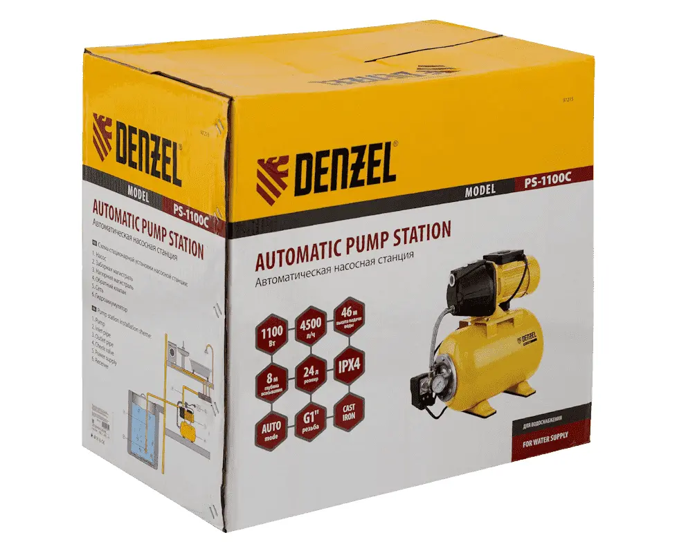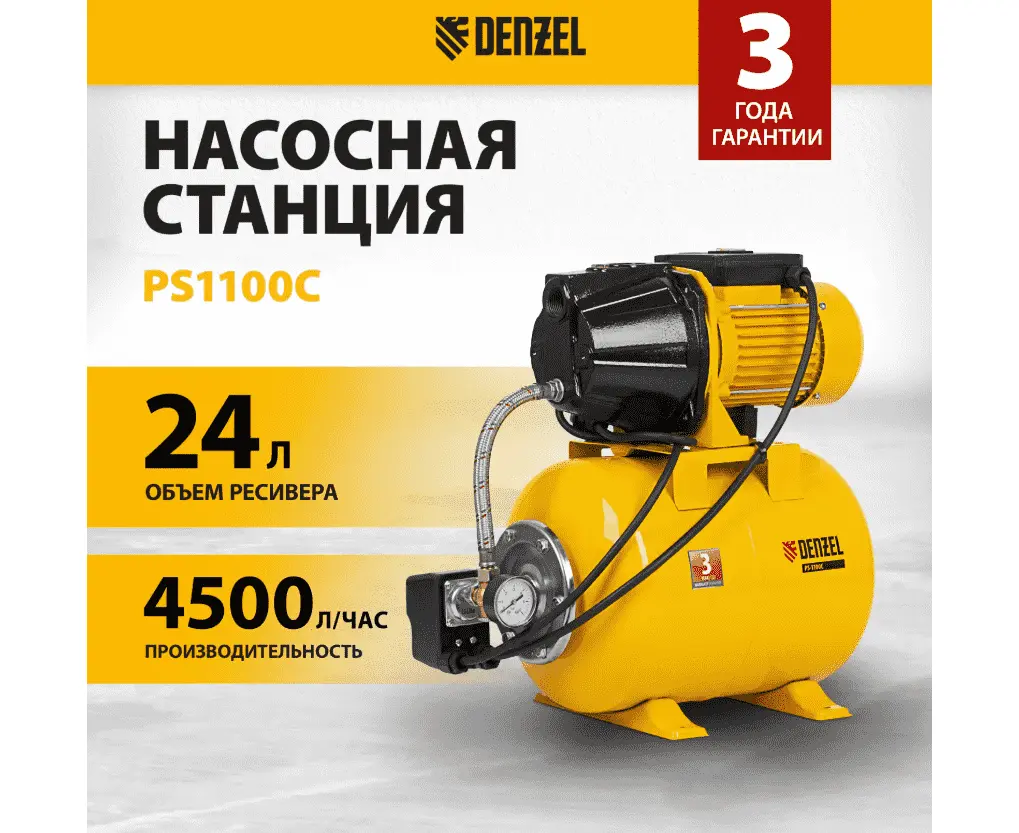 Насосная станция Denzel (Дензел) PS1100С - мощностью 1100 Вт и производительностью 4500 л/ч, с корпусом из чугуна и ресивером на 24 л, способна перекачивать чистую воду с глубины до 8 м и обеспечивает напор до 46 м. Подходит для подачи воды из колодцев и резервуаров в несколько точек разбора одновременно — на кухню, в баню, душ и систему полива. Вместительный ресивер накапливает воду, снижая количество включений и нагрузку на двигатель, а также обеспечивая запас воды на случай отключения электричества. Станция работает в автоматическом режиме и не требует постоянного контроля пользователя.