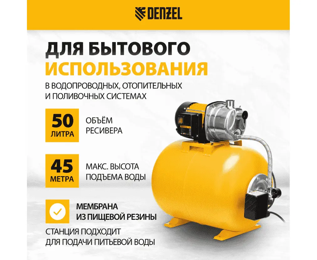 Насосная станция Denzel (Дензел) PSL1100X - мощностью 1100 Вт, с ресивером объемом 50 л, с корпусом из «нержавейки», способна перекачивать 3600 л чистой воды в час, обеспечивая ее подъем на высоту до 45 м. Максимальная глубина всасывания составляет 8 м. Станция автоматически поддерживает нужное давление и используется для подачи воды в систему водоснабжения жилого дома или производственного объекта. Бак объемом 50 л позволяет снизить частоту включений насоса, тем самым увеличив срок службы насосной станции.