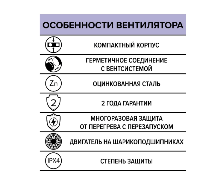 В вентиляторе установлен однофазный двигатель на шарикоподшипниках с внешним ротором, который оснащен рабочим колесом с загнутыми назад лопатками. Мотор имеет тепловую защиту с автоматическим перезапуском.
