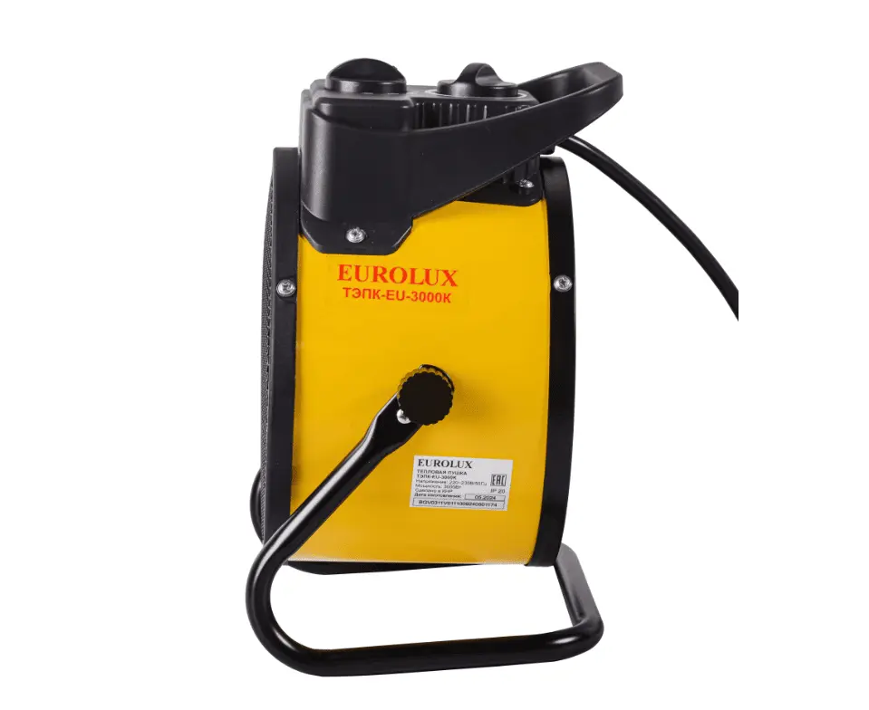 Модель Eurolux ТЭПК-EU-3000К имеет металлическую подставку для устойчивого размещения на различных поверхностях. С ее помощью можно изменять угол направления теплого воздуха. Панель управления, расположенная на корпусе, состоит из механических регуляторов режимов и температуры. Это позволяет автоматически поддерживать выбранный уровень нагрева. Круглая форма корпуса обеспечивает равномерное рассеивание тепла. Удобная ручка для перемещения расположена в верхней части электрической тепловой пушки.