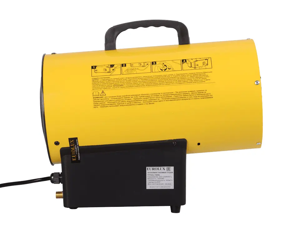 Газовая тепловая пушка Eurolux (Евролюкс) ТГП-EU-15000 - предназначена для обогрева складских, производственных, хозяйственных помещений и строительных площадок. В качестве топлива используется сжиженный пропан, пропан-бутан или бутан в баллонах. Сжигаемый в камере сгорания, газ обеспечивает прямой нагрев воздуха. Для работы вентилятора и пьезоэлемента требуется подключение тепловой пушки к однофазной электросети.