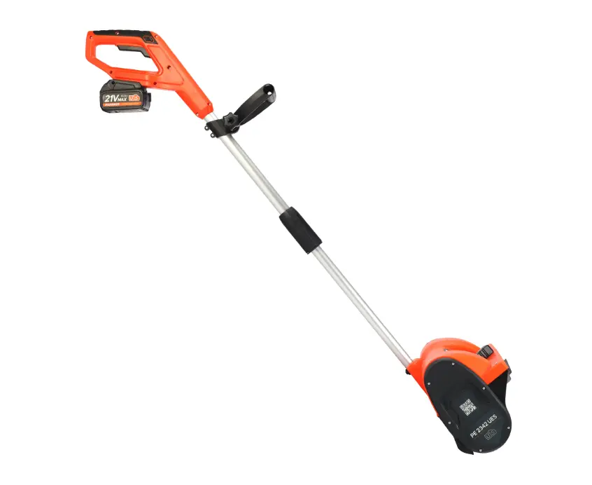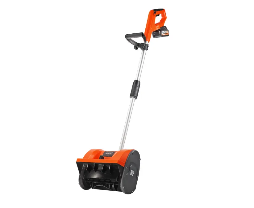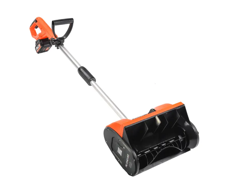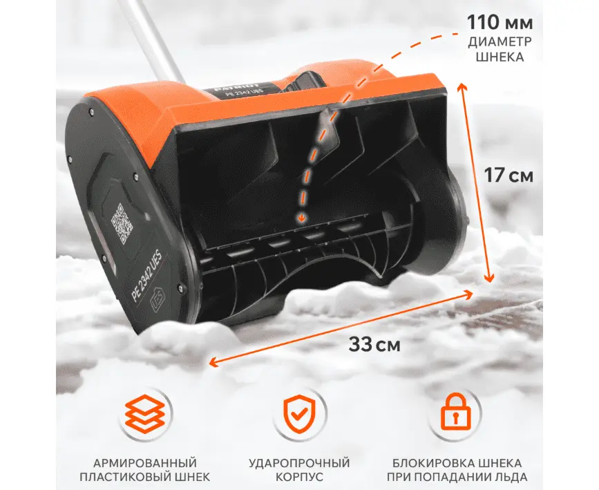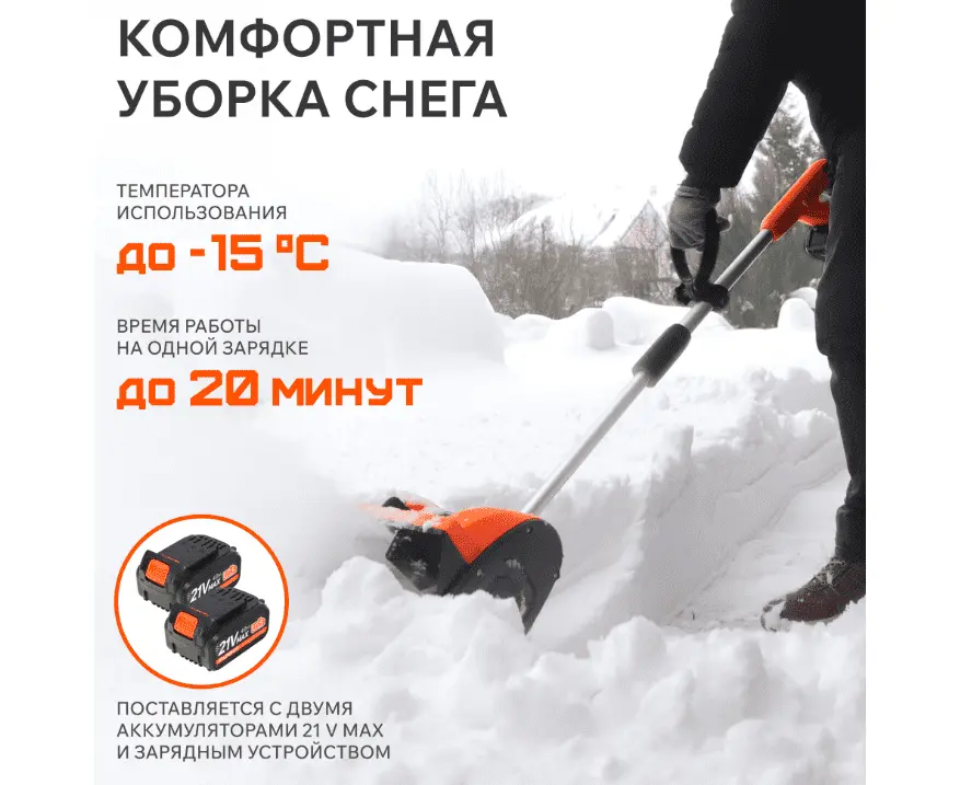 Одноступенчатый шнек (диаметр 11 см) из армированного пластика и удобный ковш (ширина 33 см). Корпус из ударопрочного ABS-пластика. Работа от литий-ионного аккумулятора единой аккумуляторной платформы UES до 20 минут. Время зарядки аккумулятора до 2 часов. Небольшие габариты и складная рукоять упрощают хранение.