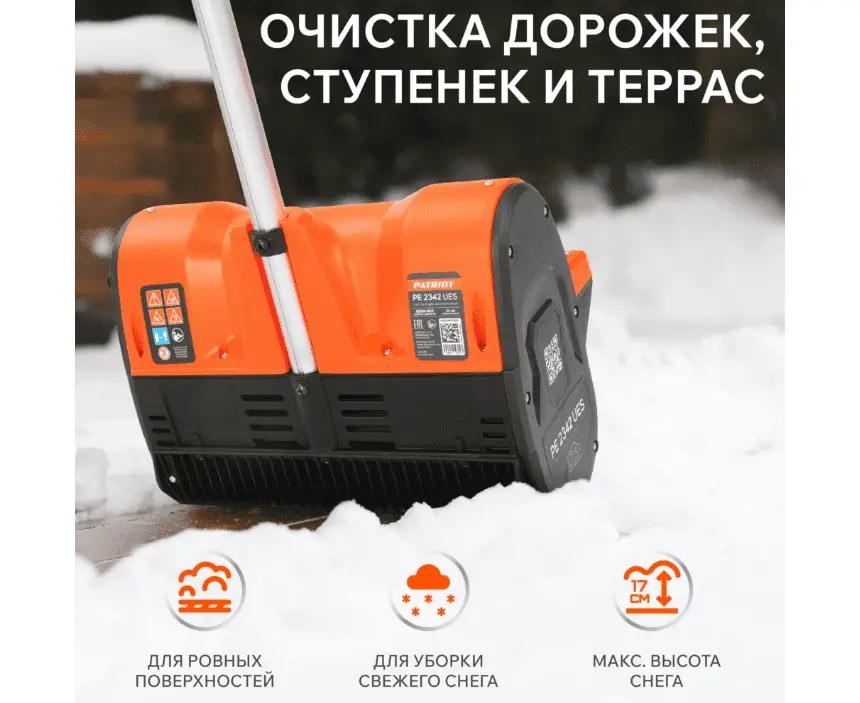 Снегоуборщик Patriot (Патриот) PE 2342 UES - аккуратно очистит площадки с декоративным покрытием и садовые дорожки, для эксплуатации на ровных поверхностях. Хватит, чтобы убрать небольшую придомовую территорию до 20 квадратных метров. Дальность выброса снега до 5 метров. Регулировка направления выброса снега специальным рычагом на ковше.