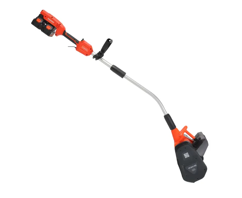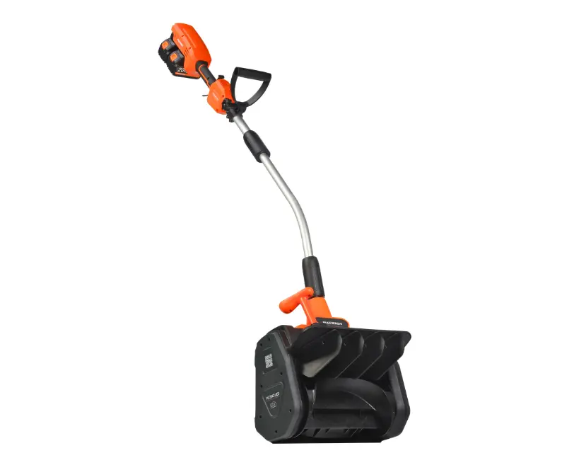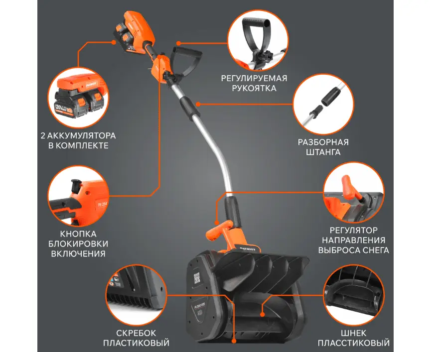 Средняя продолжительность работы снегоуборщика на двух аккумуляторах — до 20 минут. Электрический двигатель мощностью 0,85 кВт. Максимальная частота вращения шнека 1800 об/мин.