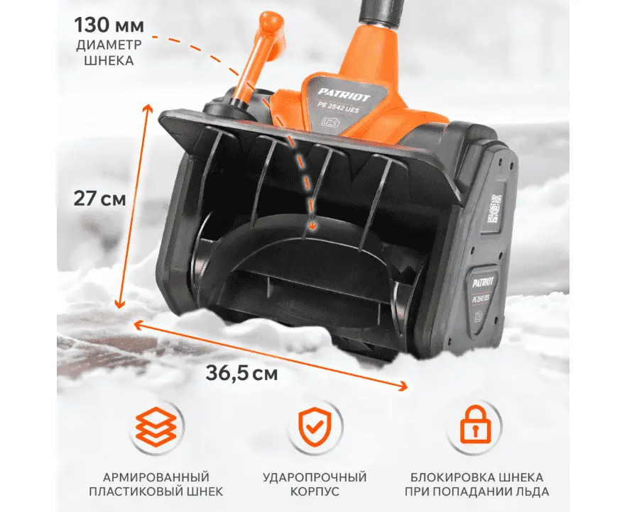 Снегоуборщик Patriot (Патриот) PE 2542 UES - для эксплуатации на ровных поверхностях со свежим рыхлым снегом, высотой до 27 см. Очистит небольшую площадь до 20м2. Имеет одноступенчатый шнек (диаметр 13 см) из армированного пластика и ковш (36,5х27 см). Подойдет для работы на площадке с декоративным покрытием или садовых дорожках. Работает на двух одновременно подключённых аккумуляторах системы UES.