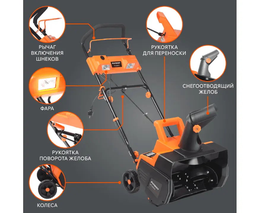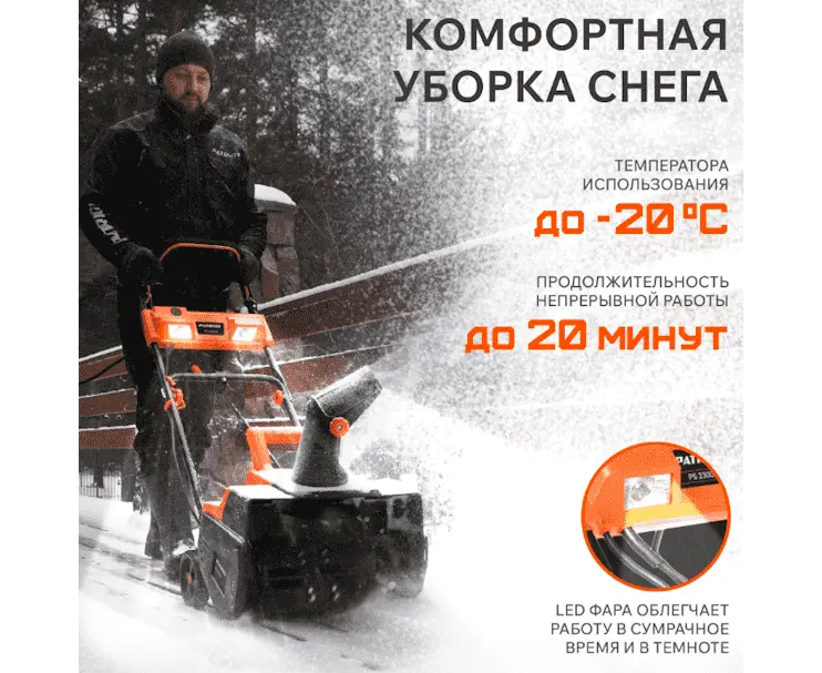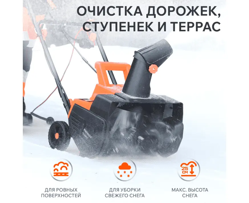 Снегоуборщик Patriot (Патриот) PS 2300 Е - для быстрой очистки небольших территорий на приусадебных участках или городских дворах. Оснащена обрезиненным шнеком, защищающем декоративные покрытия на участке от царапин. Небольшой вес и дополнительные колеса обеспечивают максимально комфортную и быструю уборку, а регулируемый желоб позволяет настроить выброс снега. Складная рукоятка способствует компактному хранению инструмент. Для работы в тёмное время суток установлена светодиодная фара.