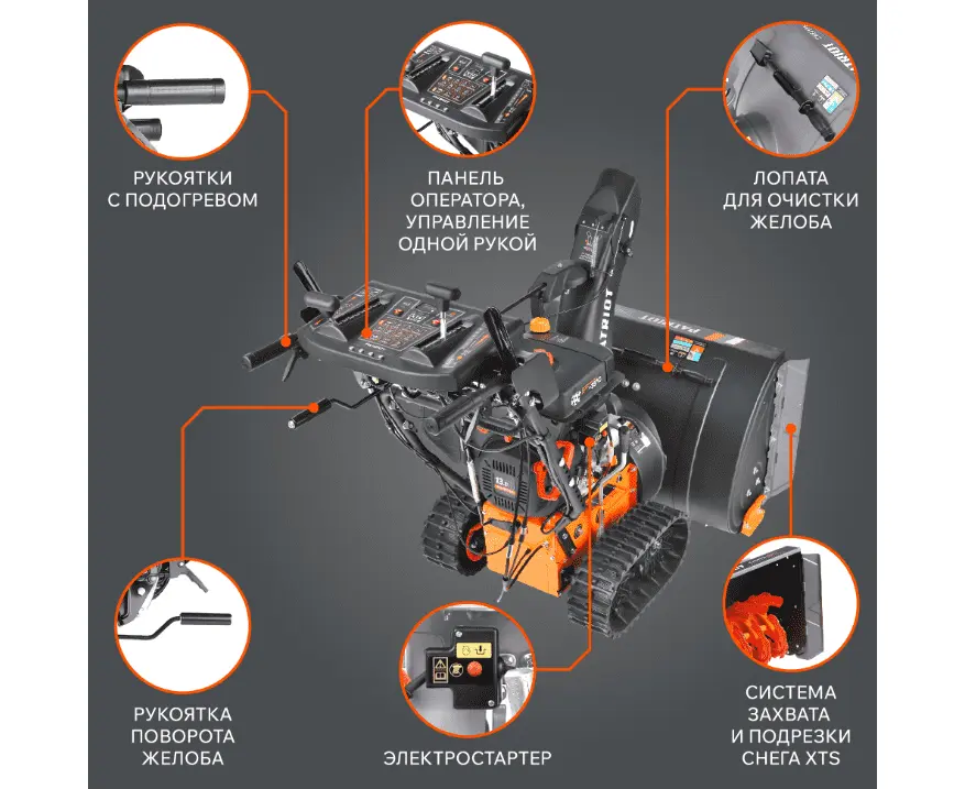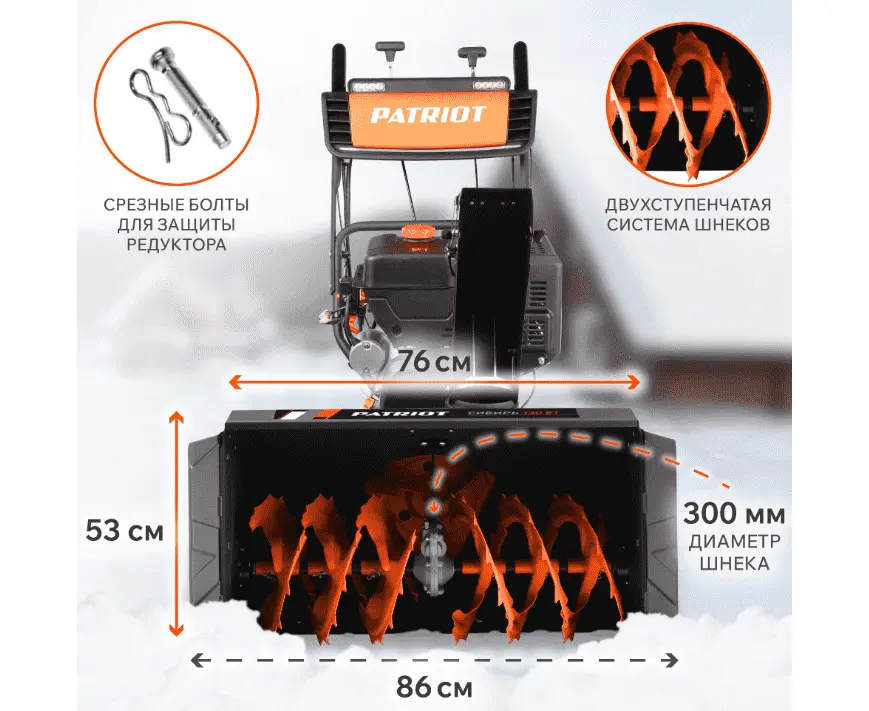 Снегоуборщик Patriot (Патриот) Сибирь 130 ET - подходит для уборки снега и расчистки снежных заносов. Высокий зубчатый шнек с агрессивным дизайном перемалывает любой вид снега, включая сырой и обледеневший. Система XTS расширяет возможности для уборки на 10%, увеличивая площадь и высоту захвата. «Зимний» двигатель защищен от сильных морозов до -35 градусов, а функция электростарта позволяет запустить его по нажатию одной кнопки. Для работы в темное время модель оснащена LED фарой. Управление вынесено на отдельную панель, оснащённую счётчиком моточасов\тахометром и дающую быстрый доступ ко всем его элементам.
