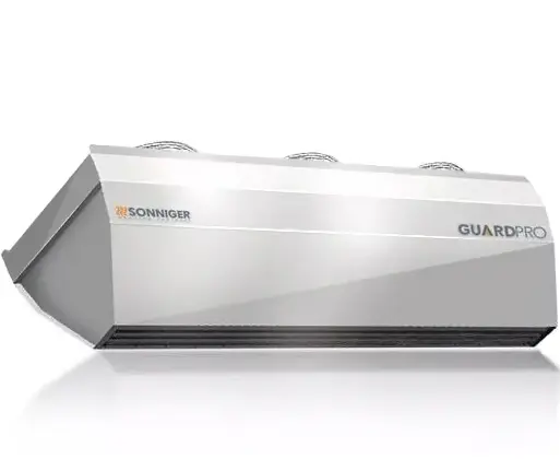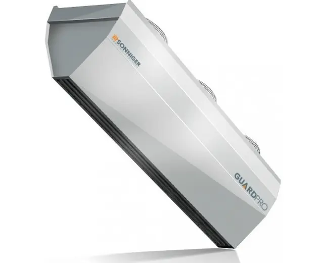 Воздушная завеса Sonniger GUARD PRO обеспечивает защиту проемов высотой 8 м. Данные завесы предназначены для таких помещений как производственные и складские комплексы, ремонтные депо, автобусные парки, ангары. Благодаря классу защиты IP 54 завесы можно устанавливать во влажных и сильно запыленных помещениях, например на автомойках.